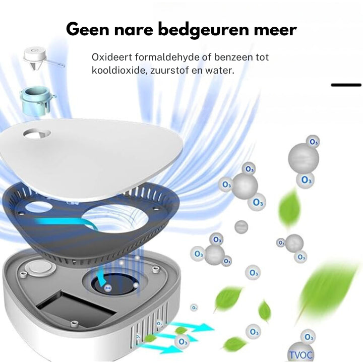 AirNest™ werkt al binnen 5 minuten! Door ozon (O₃) te genereren, richt het zich direct op geurveroorzakende deeltjes en neutraliseert deze, waardoor je ruimte fris en schoon blijft.